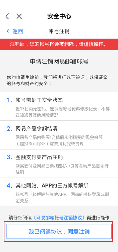 5.然后继续阅读注销账号通知,确保自己的账号需要注销,点击【我已阅读协议,同意注销】,之后按照提示进行注销即可(注意网易邮箱账号会将网易邮箱一并注销);