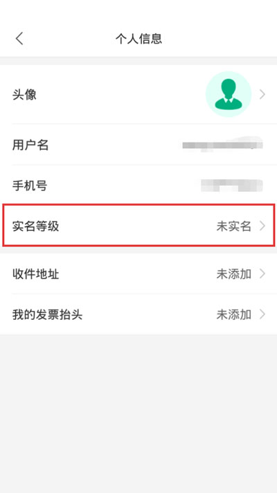 2.点击进行实名认证,进入个人信息页面后,点击【实名等级】进入实名认证页面;