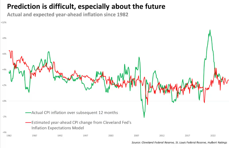 下图显示了克利夫兰联储通胀预期模型在过去四十年中的记录。赫尔伯特说:“一方面,你会注意到该模型低估了2021年和2022年的通胀飙升。另一方面,该模型正确地预测了这次通胀飙升将是短暂的。”