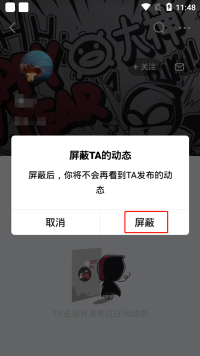 3.最后在确认屏蔽TA的动态页面,点击【屏蔽】,屏蔽之后,我们将不会再收到TA的动态发布;