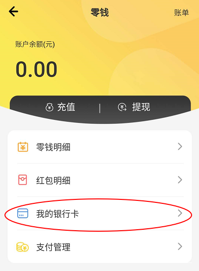 3、在零钱界面,点击我的银行卡,进入绑定界面。