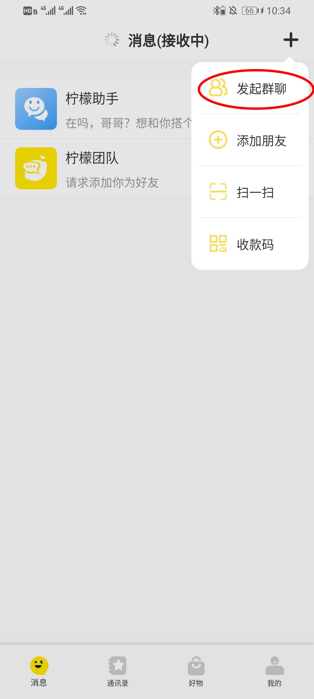 1、打开柠檬畅聊APP,在首页点击右上方的加号,在弹出的选项中点击发起群聊。
