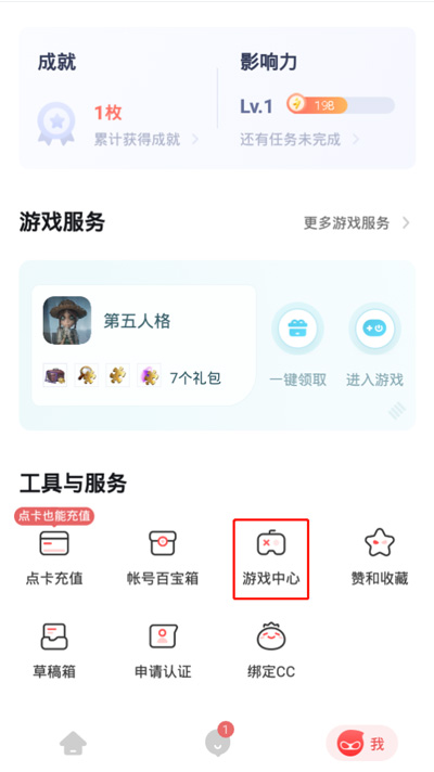 2.进入我的页面后,下滑找到“工具与服务”下方的【游戏中心】;