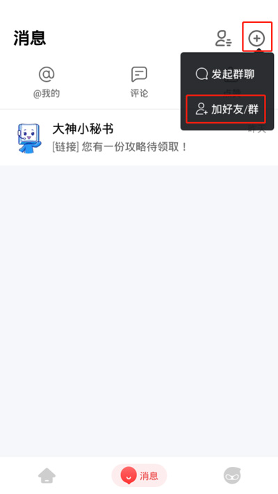 2.记住昵称之后,在下方的功能栏中选择【消息】,在消息页面点击右上角的【 】选择【加好友/群】;