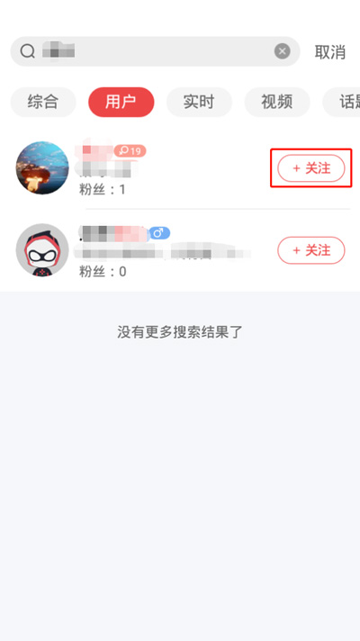 3.然后输入好友的昵称,在输入法中点击回车键搜索,然后在搜索结果中找到我们需要添加的好友,点击【 关注】;