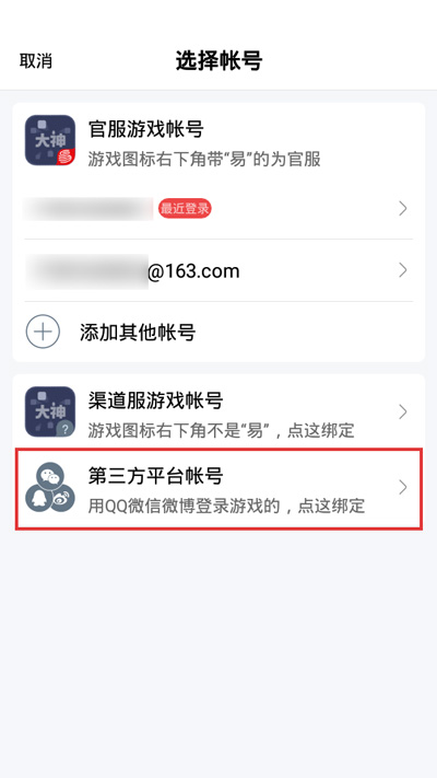 4.然后选择【第三方平台账号】绑定,因为我们阴阳师登录的账号是使用第三方账号QQ、微信登录的;