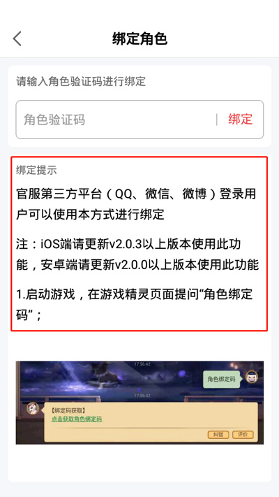 6.【第三方平台账号】则需要从游戏中获得角色绑定码,按照下方的【绑定提示】从游戏获得角色绑定码,复制角色绑定码在网易大神APP内绑定游戏角色;