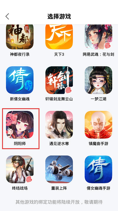 3.然后需要选择我们绑定的游戏,以阴阳师为例,找到阴阳师进入绑定游戏角色页面;