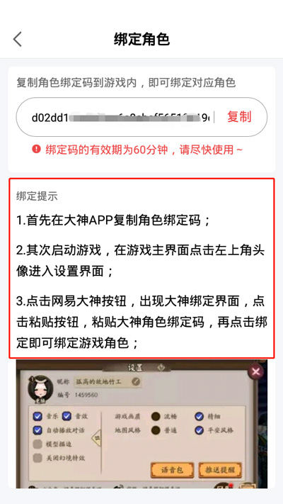 5.【渠道服游戏账号】需要从网易大神APP复制角色绑定码,再进入游戏使用角色绑定码绑定账号,按照下方的【绑定提示】绑定游戏角色;