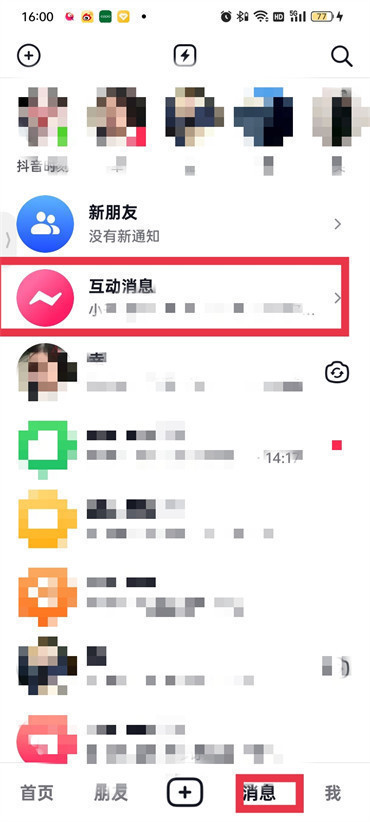 1.首先打开抖音软件进入到抖音页面之后点击右下方的【消息】,来到消息页面之后点击【互动消息】;