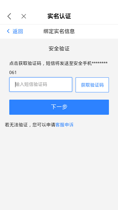 7.在进行实名认证之前,需要进行手机号码的安全验证,使用手机号码接收短信验证码,点击【下一步】;