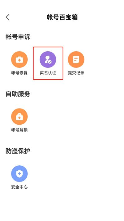 2.之后点击账号申诉中的【实名认证】进行实名认证;
