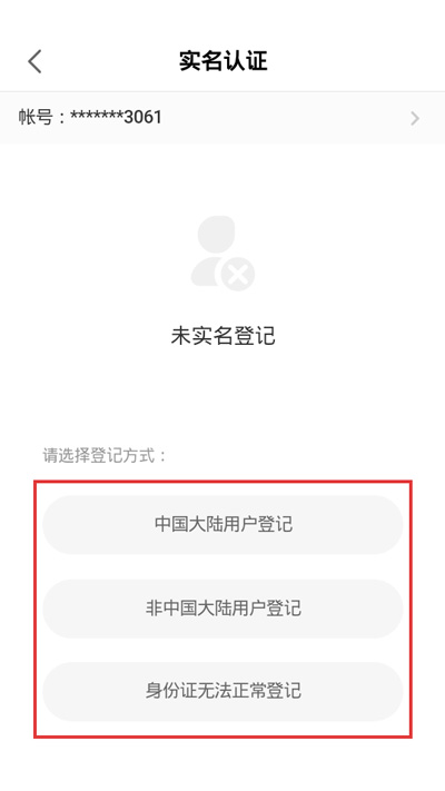 3.进入实名认证之后,需要选择一个登记方式:中国大陆用户登记、非中国大陆用户登记、身份证无法正常登记;