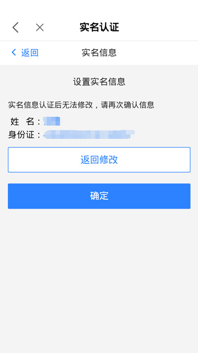9.在确认实名认证信息页面,确认自己认证的实名认证信息是否有误,点击【确定】后就无法再修改身份证信息了;