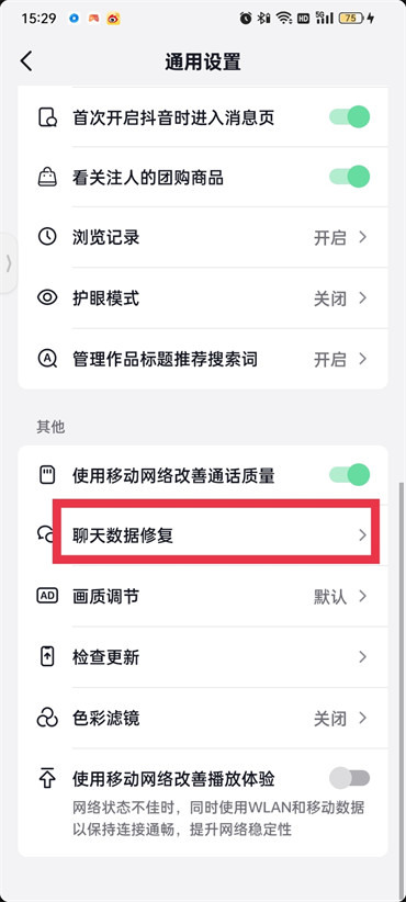 4.来到通用设置的页面找到【聊天数据修复】点击进入到,然后修复你要恢复的聊天记录即可;