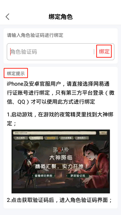 6.这里以第三方平台账号为例,按照下方获取角色验证码的步骤,进入游戏获取角色验证码,并输入角色验证码,点击【绑定】即可完成角色绑定;