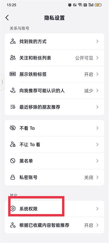 4.进入到隐私设置的页面之后往上滑动找到【系统权限】点击;
