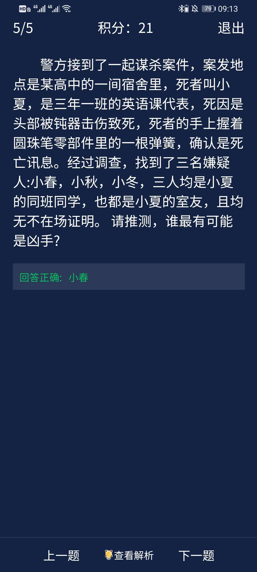 答案解析:死者手上握着弹簧,且其又是英语课代表,也就暗示着凶手和弹簧的英文有关。而弹簧的英文是°spring” 和春天的英文是- -样的。所以,凶手最有可能是小春。