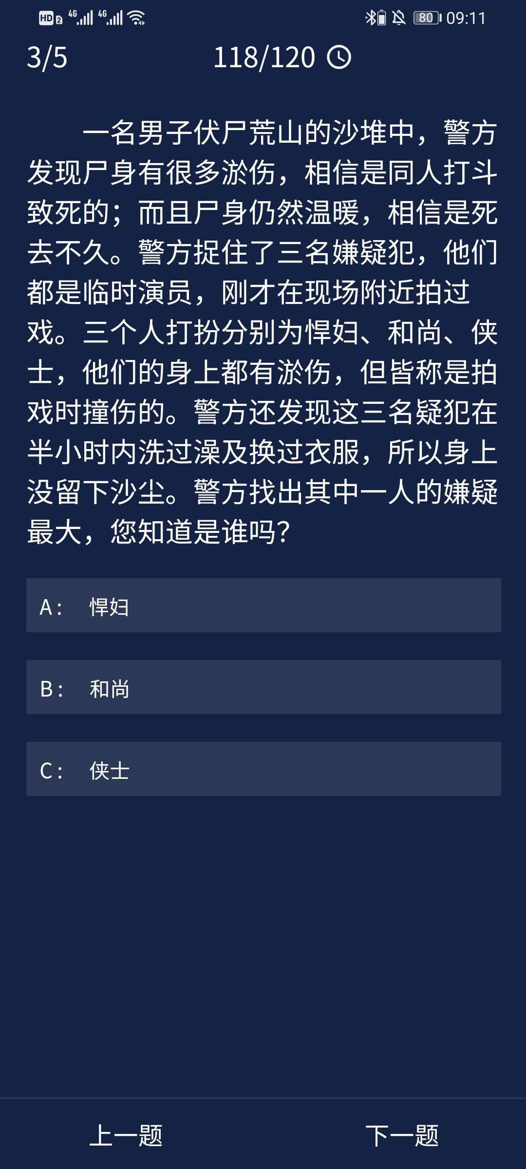 3、一名男子伏尸荒山的沙堆中,警方发现户身有很多淤伤,相信是同人打斗致死的;而且尸身仍然温暖,相信是死去不久。警方捉住了三名嫌疑犯,他们都是临时演员,刚才在现场附近拍过戏。三个人打扮分别为悍妇、和尚、侠士,他们的身上都有淤伤,但皆称是拍戏时撞伤的。警方还发现这三名疑犯在半小时内洗过澡及换过衣服,所以身上没留下沙尘。警方找出其中一人的嫌疑最大,您知道是谁吗?