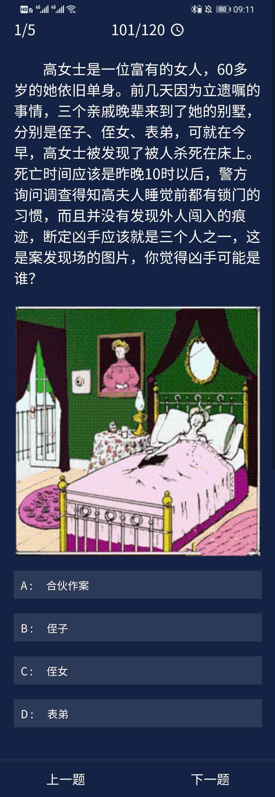 答案解析:从案发现场照片来看,高夫人是几乎半裸坐在床上的,根据死亡时间和现场环境来看,高女士当时应该是准备就寝,加上高女士有睡觉锁门的习惯,如果当时进入房间的是男性,她一-定不会开门后再.上床脱掉衣物,所以基本可以判定凶手就是同为女性的她的侄女。