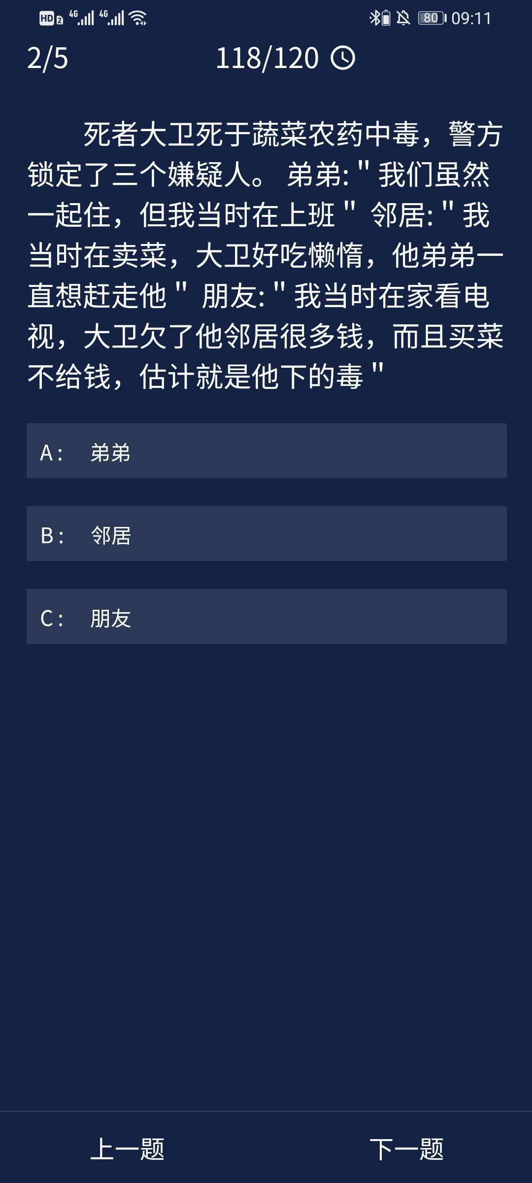 2、死者大卫死于蔬菜农药中毒,警方锁定了三个嫌疑人。弟弟: ”"我们虽然一起住,但我当时在上班"邻居:"我当时在卖菜,大卫好吃懒惰,他弟弟一直想赶走他"朋友: "我当时在家看电视,大卫欠了他邻居很多钱,而且买菜不给钱,估计就是他下的毒。