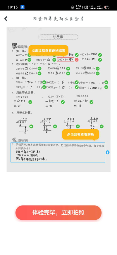 3.拍照检测之后,出现红框的为做错的,点击查看识别结果,点击蓝框可以查看题目解析;