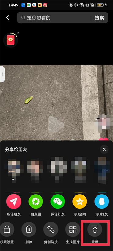 3.然后在弹出来看来的选项中找到【置顶】点击即可;