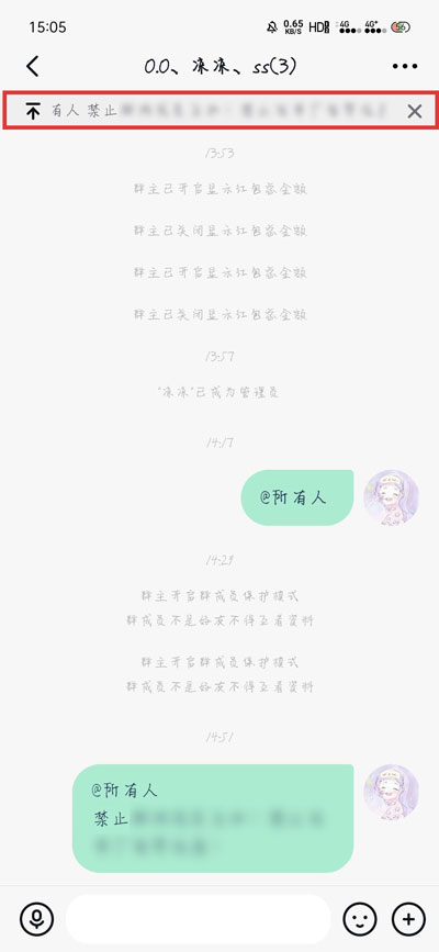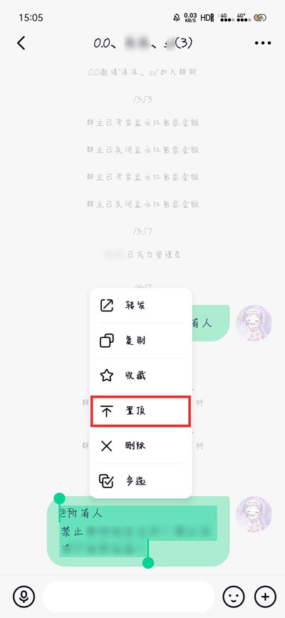 3.置顶后的消息会在最上方、群聊名下方显示,并且会以飘屏的样式显示;