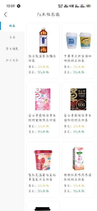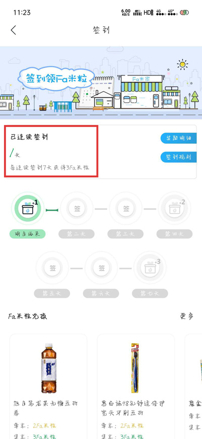 3.签到之后获得的fa米粒,可以在首页的【fa米粒兑换】处消耗,兑换对应的商品消费券;