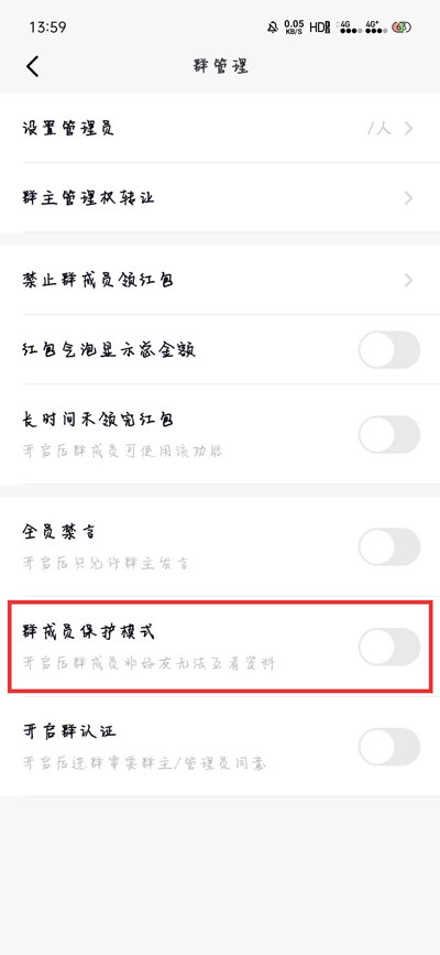3.接着找到并开启【群成员保护模式】,开启后,非好友成员无法查看对方的资料,无法查看资料就无法添加好友了;