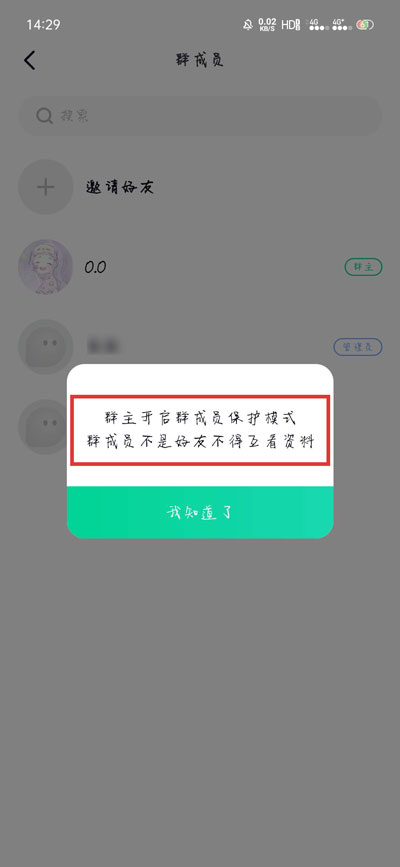 4.如果群中的成员在群成员中点击某个成员,准备查看对方的资料时,就会弹出“群主开启群成员保护模式,群成员不是好友不得互看资料”;