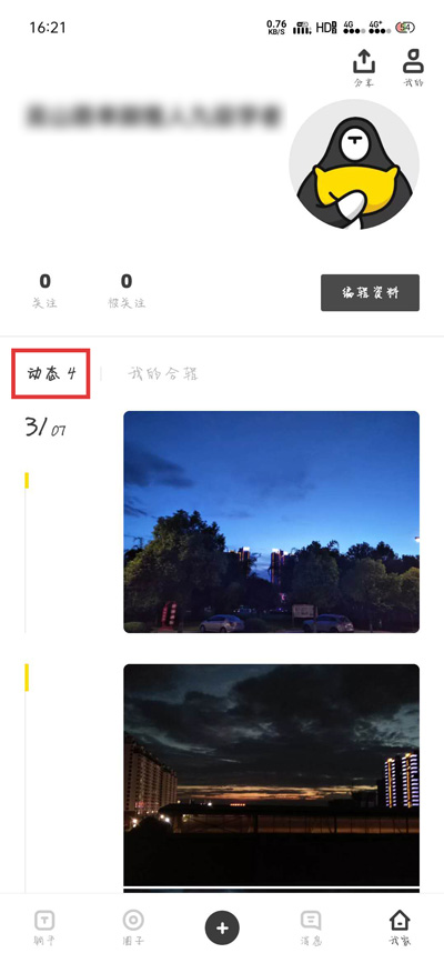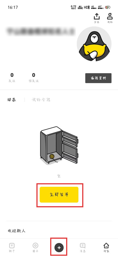 3.返回进入【我的】页面,此时可以看到当前账号下没有一篇动态,点击【立即发布】或者下方的【 】发布动态(注意发布之前需要进行实名认证);