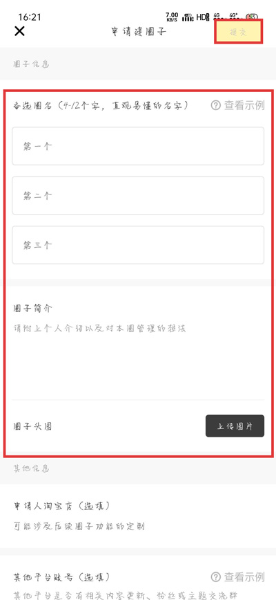 9.填写申请建圈子的信息,输入圈名、圈子简介、圈子头图等等,点击【提交】即可(注意提交后的信息不可再修改);