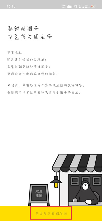 2.进入之后,可以看到创建圈子的条件:发布三篇相关贴,所以我们需要发布三篇和我们需要创建的圈子内容相关的动态帖子;