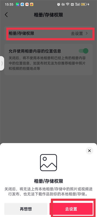 6.进入到该页面继续点击【相册/储存权限】,然后在页面下面弹出的对话框中点击【去设置】;