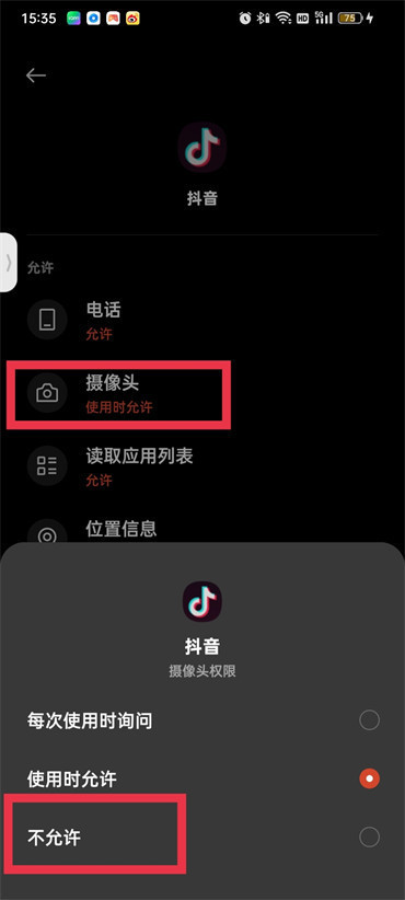 8.进入到权限管理的页面点击【摄像头】,最后在页面下面弹出的对话框中点击【不允许】即可;