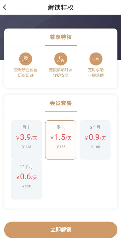 行迹定位软件需要解锁特权才可以解锁更多功能更多姿势,不过行迹定位软件的特权是非常贵的,只有买季卡才划算。