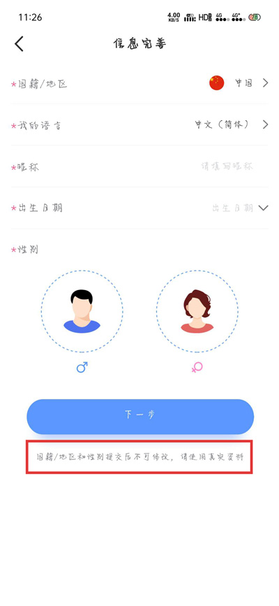 worldtalk是一款国际化的交友聊天软件,我们在使用时,可以和中国、欧美、日韩、俄罗斯、乌克兰、东南亚等180多个国家和地区的用户加好友聊天,目前worldtalk不支持用户修改自己选择的国籍,在完善信息时,已经提示我们了,国籍/地区和性别在提交之后就无法修改了。
