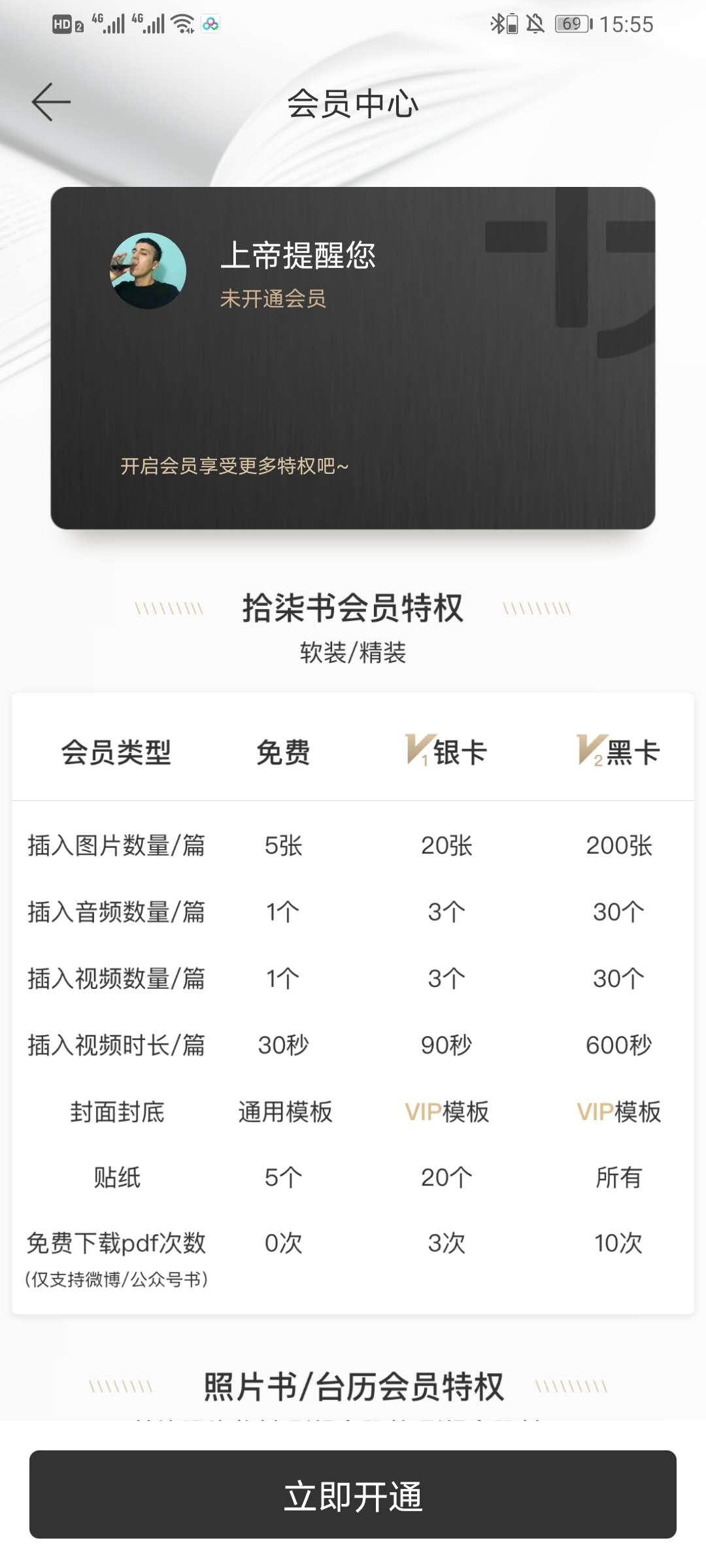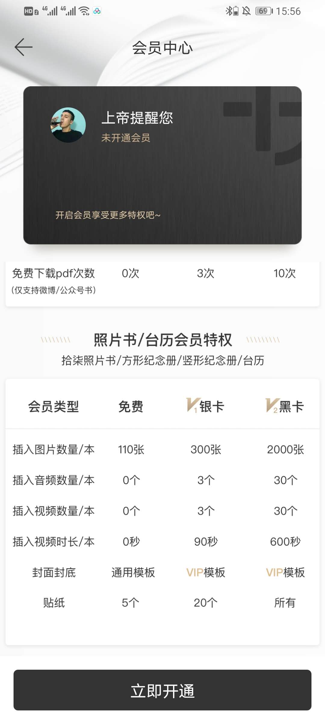 比如说如果不是会员的话那么放入书中的图片视频还有音乐都是有限制的,必须要有会员才可以拥有更多的权限,会员分为银卡会员和黑卡会员放