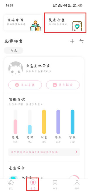 2.也可以通过【星盘】页面点击右上角的【关系合盘】进入合盘页面;