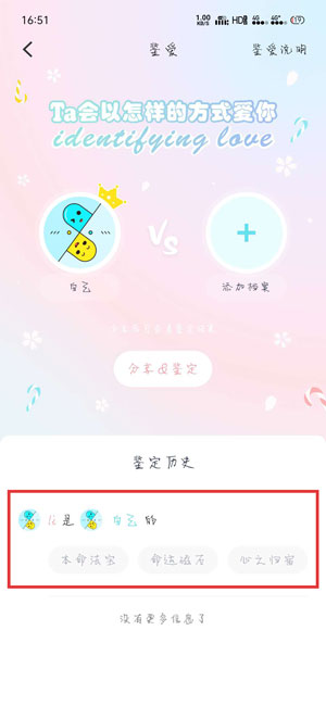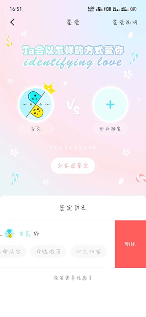 4.最后在鉴爱页面的下方,可以看到之前的鉴爱历史,按住需要删除的鉴爱记录,往左滑动;