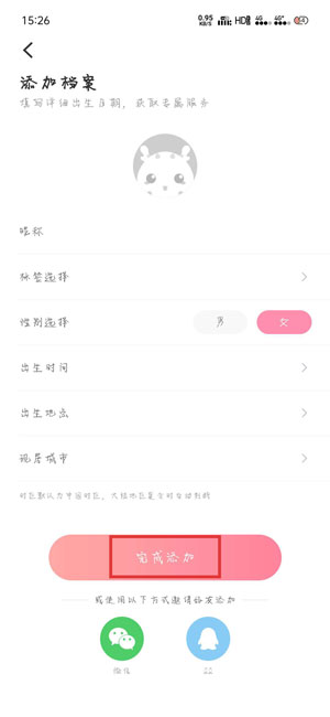 2.在添加档案页面,输入自己、和对方的出生日期、地点等信息,完善之后点击【完成添加】;
