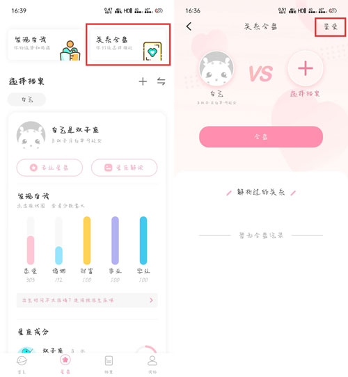 5.我们也可以通过【星座】页面点击【关系合盘】进入合盘,继续点击右上角【鉴爱】进入鉴爱页面;