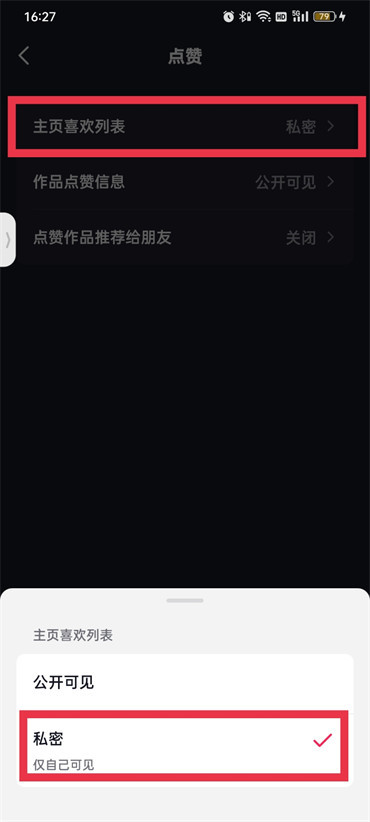 5.来到点赞的页面中点击【主页喜欢列表】,然后在页面下面弹出的对话框中点击【私密】即可;