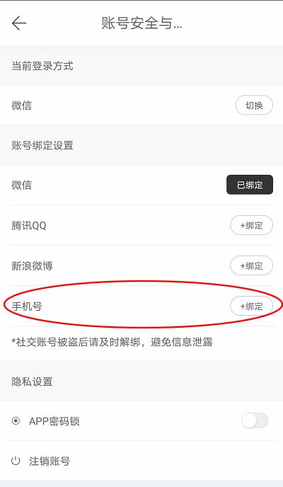 3、在账户安全与设置中找到手机号绑定,点击绑定即可、