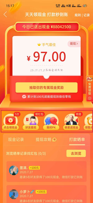 点击领现金:每人每天可以抽取5次红包,有机会直接提现;