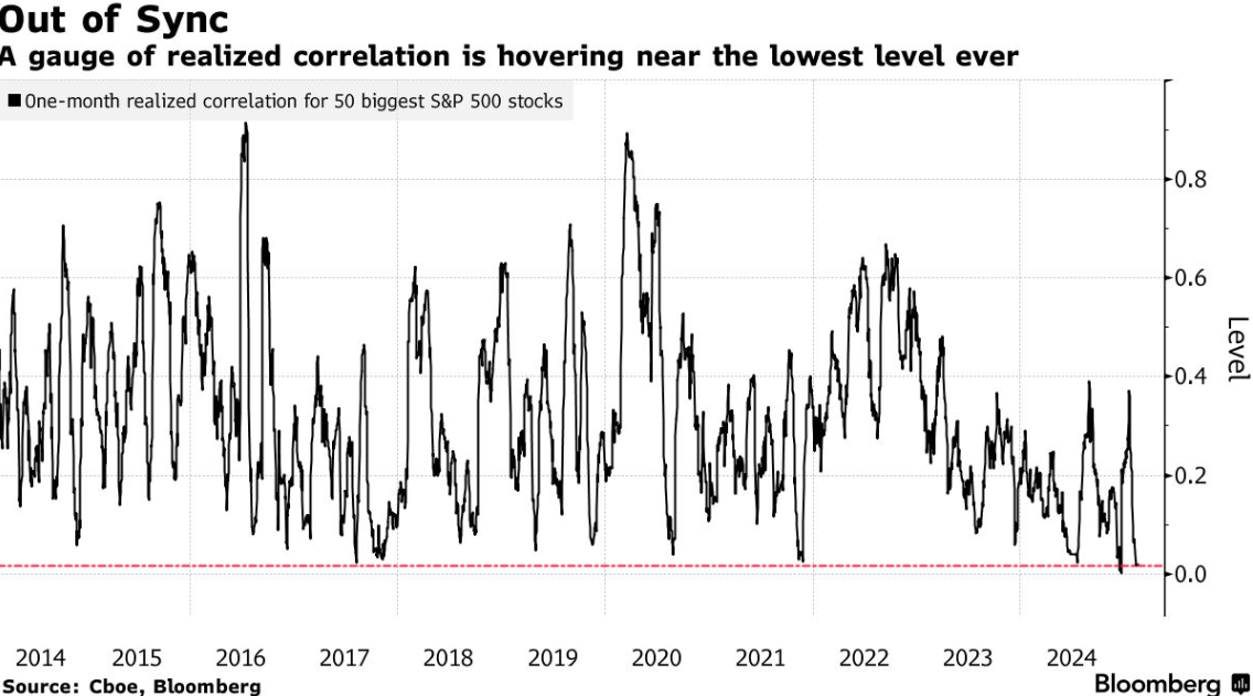 这家芯片巨头是本财报季的迟到者,大多数标普500指数公司都已经公布了业绩。财报的发布通常会使股票更多地随自身的走势而非宏观经济的头条新闻而变动,这使得标普500指数中50大公司的已实现相关性指标接近0,离历史最低水平仅一步之遥。读数为1意味着股票走势同步。