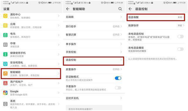 6.我们还可以通过【设置 - 智能辅助 - 语音控制 - 语音唤醒】进入开启语音幻想(EMUI 10.0版本更名为“智慧语音”);