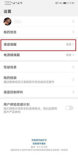 4.在语音助手设置页面,找到并点击【语音唤醒】一项,可以看到当前语音唤醒的功能是关闭的;