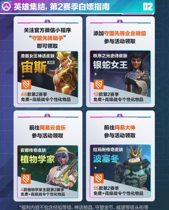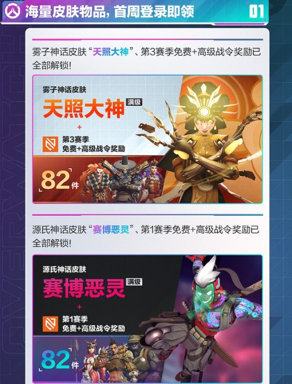1、首周领取雾子“天照大神”、源氏“赛博恶灵”及一、二赛季的物品。